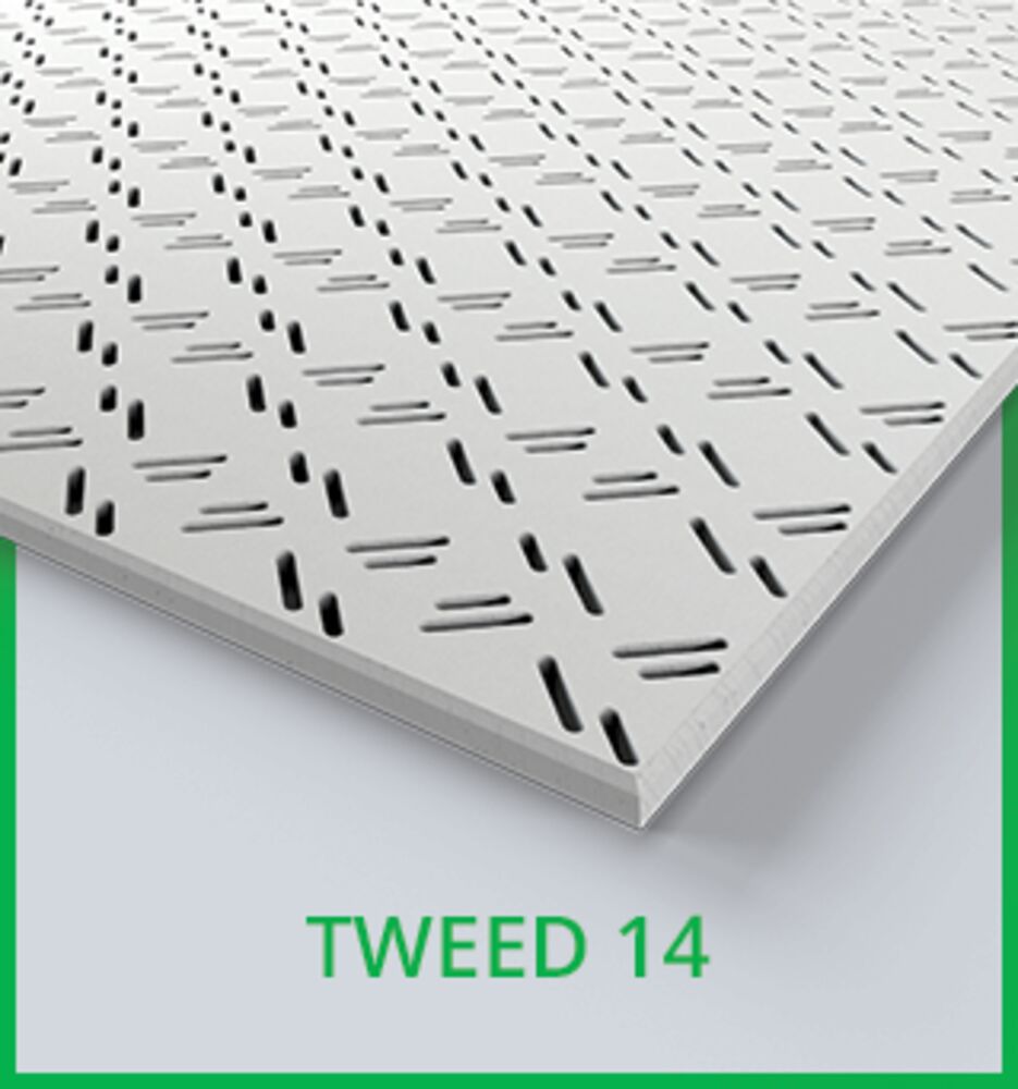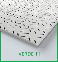 Chapa Gypsum Drywall com borda rebaixada ou quadrada, em padrões variados de furação e voltada à montagem de paredes e forros internos em ambientes propensos a ruídos.