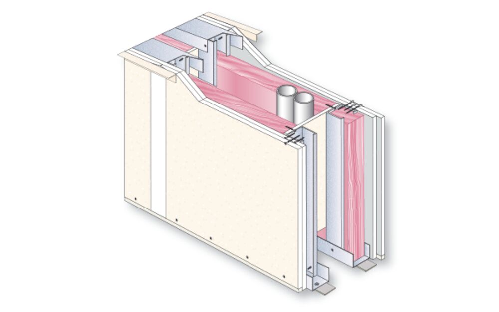 Parede com espessura, conforme pé-direito, de no mínimo 160mm e peso específico de 40kg/m². Composta por duas linhas de estrutura com perfis guias e montantes em aço galvanizado interligados por faixas de chapas de gesso, revestida com duas camadas de chapa de gesso (ST ou RU) sobrepostas em cada face. A resistência ao fogo deste tipo de parede é de no mínimo 60 minutos e seu desempenho acústico varia entre 46 dB (sem lã) a 63 dB (com lã).
